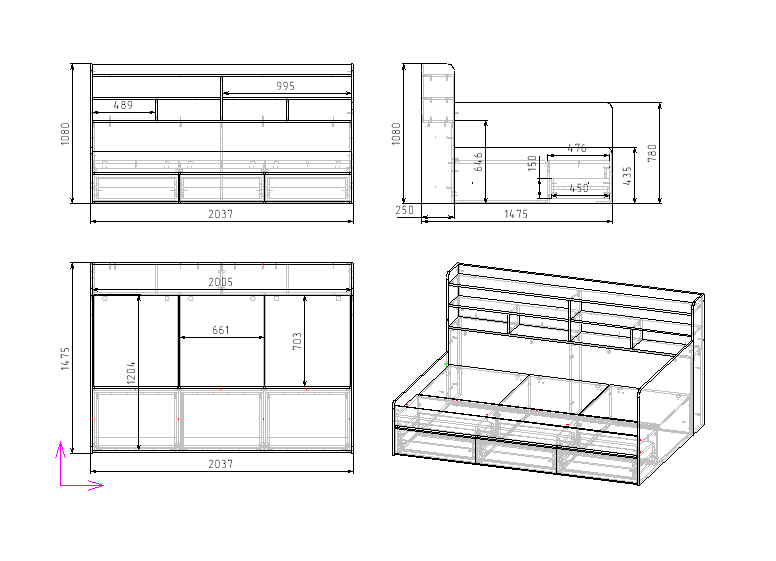 Габариты кровати: ширина 2037, высота 1080, глубина 1475 мм