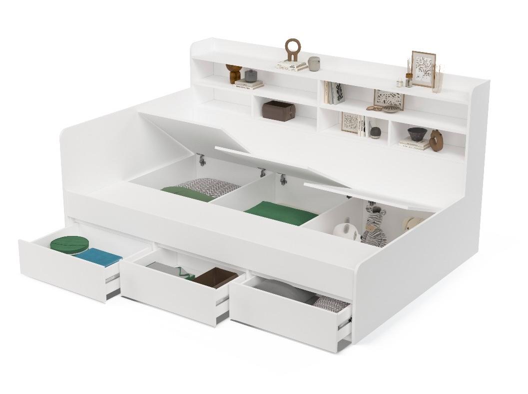 Кровать имеет 3 выдвижных ящика на шариковых направляющих, а также удобные внутренние отделения для хранения вещей.