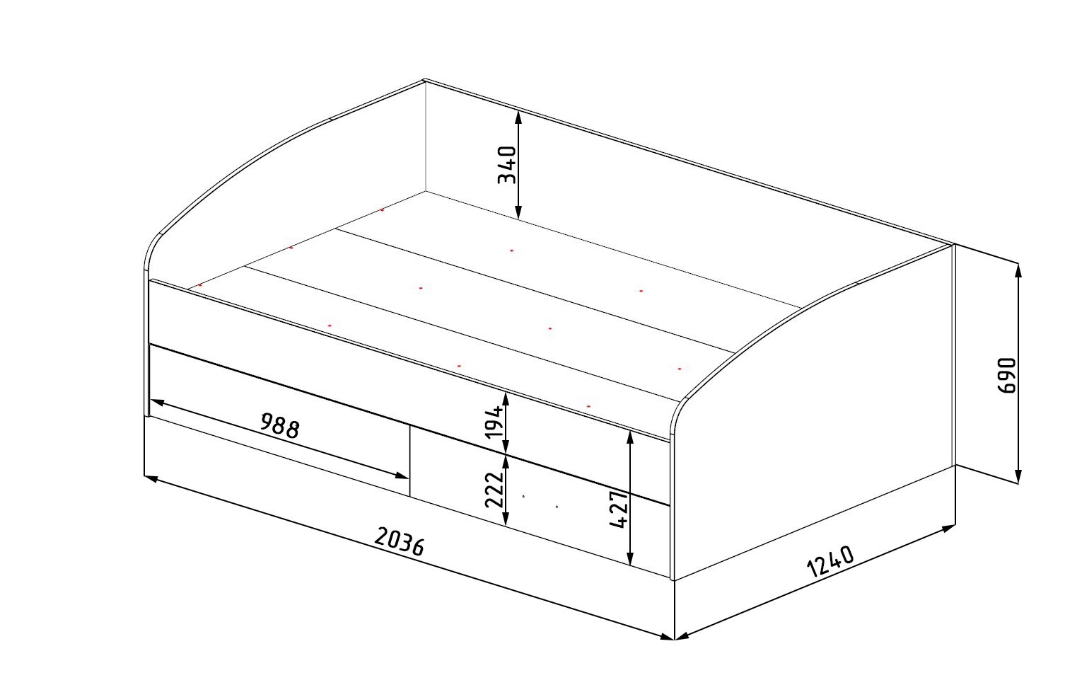 Габариты кровати: ширина 2036 х высота 690 х глубина 1240 мм