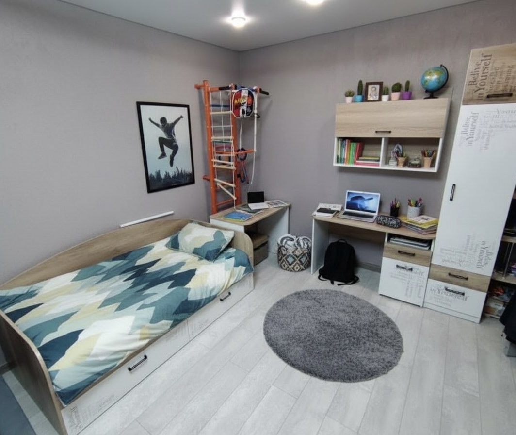 Данная модель кровати выполнена в современном дизайне, превосходно дополнит интерьер детской комнаты.