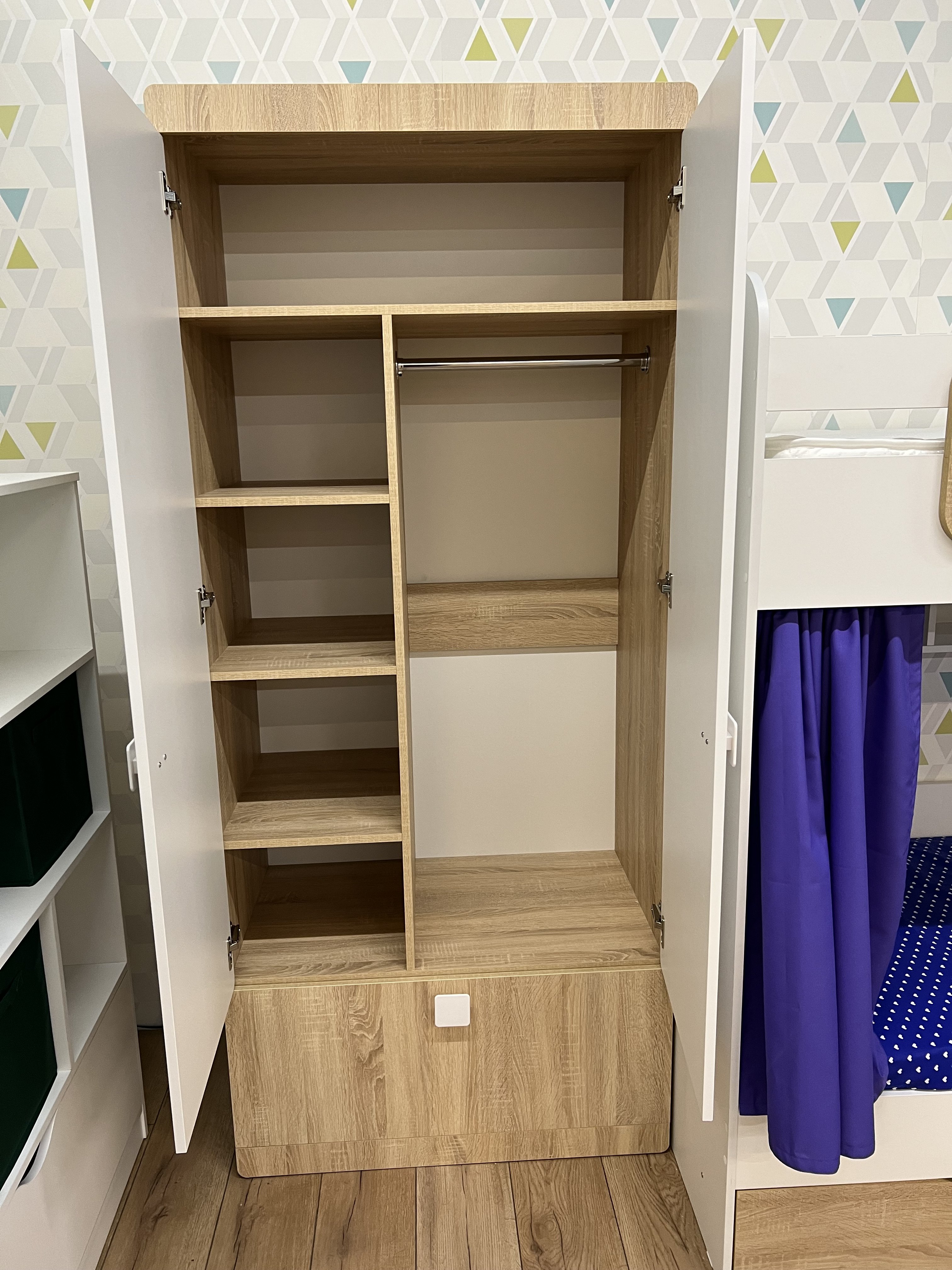 Внутри шкафа расположены штанга и боковые полки.