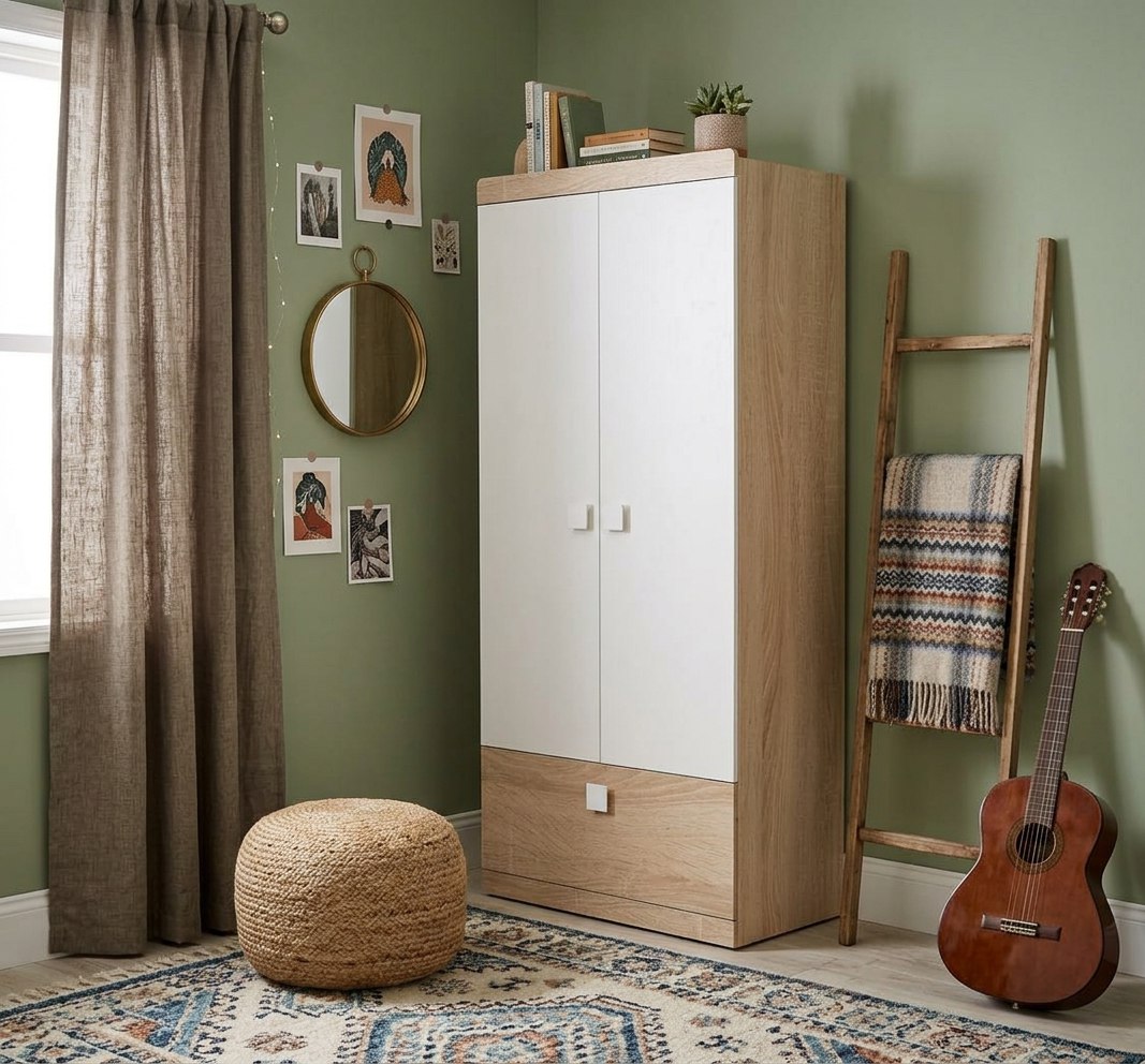 Оттенок натурального дерева "дуб сонома" дает ощущение комфорта и единения с природой, а воздушный белый цвет в интерьере работает как основа для ярких штрихов.