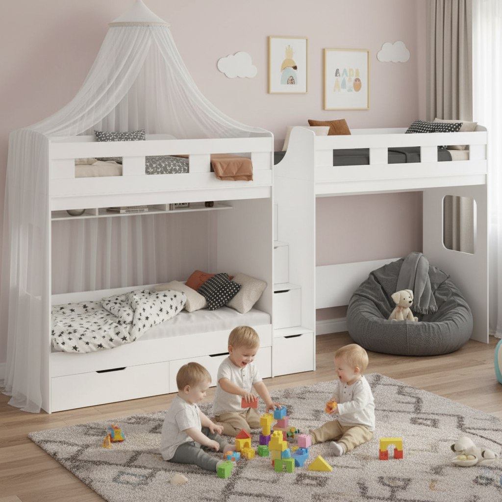 Представляем инновационное решение для пространства и комфорта в детской комнате - 3-х ярусная кровать, которая идеально подойдет для семьи с тремя детьми.