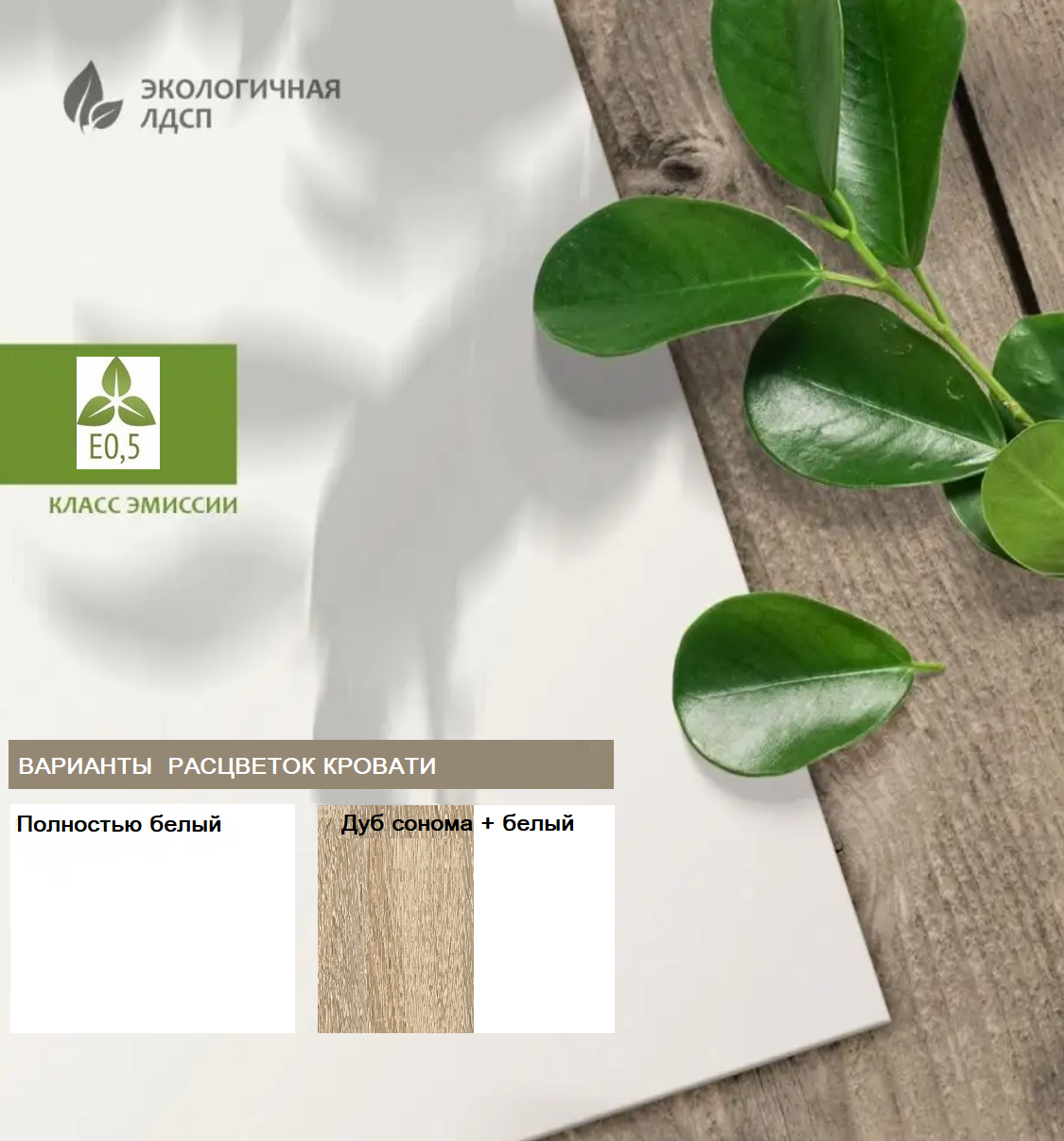 ЛДСП Е0,5. Толщина 16 мм. Кровать доступна в расцветках: полностью белый, дуб сонома+белый |