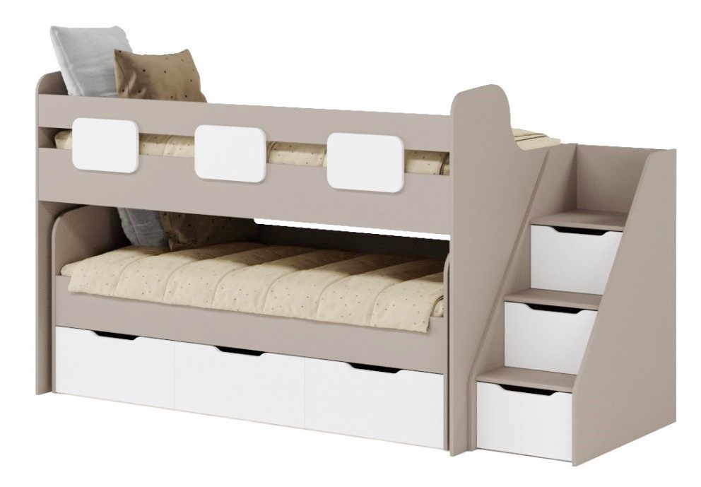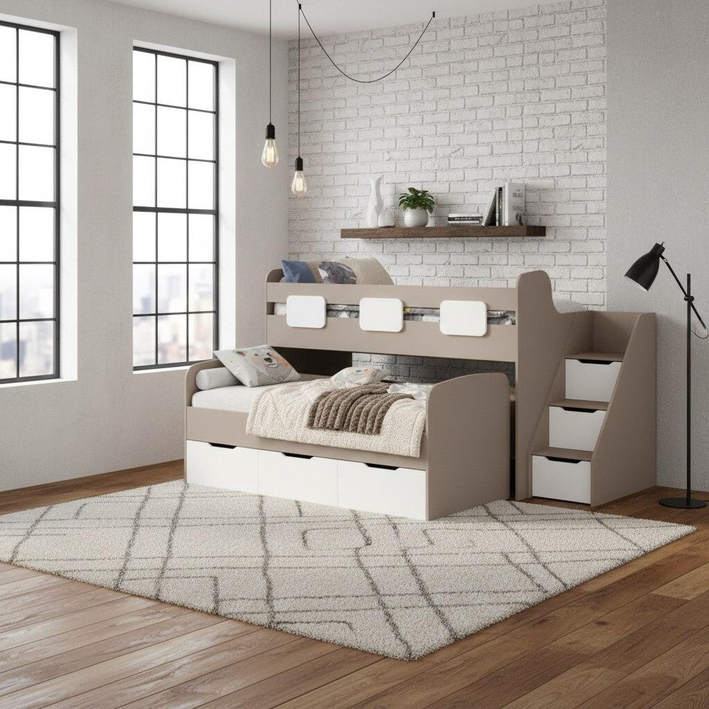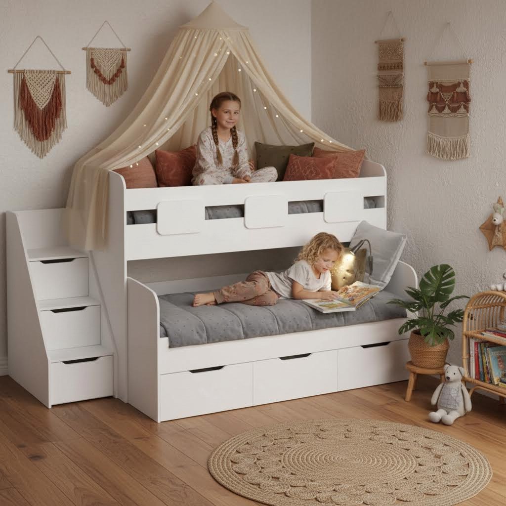 - Невысокая конструкция кровати обеспечивает удобный доступ на второй этаж, делая её идеальной даже для самых маленьких детей.