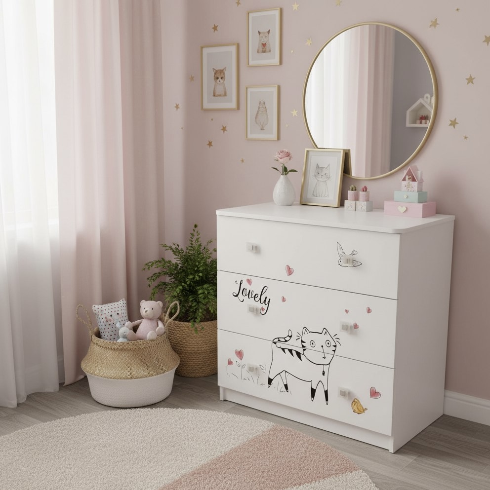 Мебель выполнена из сертифицированного, качественного, экологически чистого ЛДСП Е0,5 в белом цвете с дизайнерским принтом.