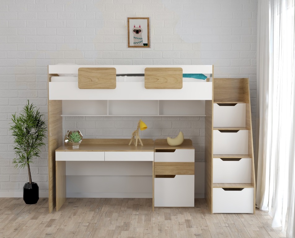 кровать-чердак Мозаика (правая/левая лестница) + Стол Мозаика + Тумба-комод Мозаика