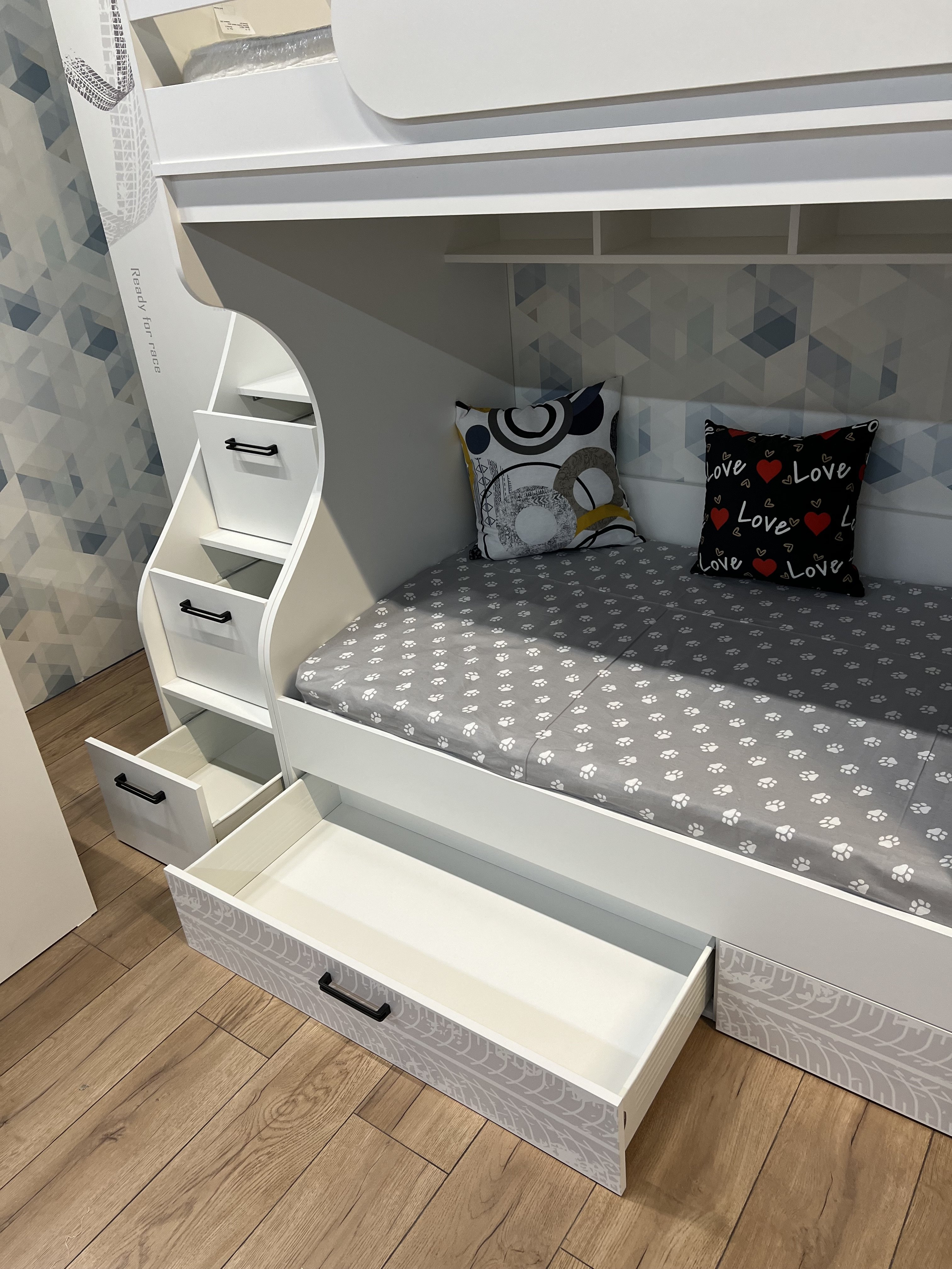 Высокая нагрузка на спальные места. Доводчики, направляющие скрытого монтажа. Прочные ящики! |
