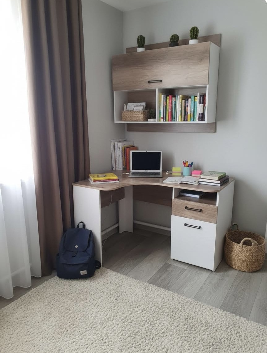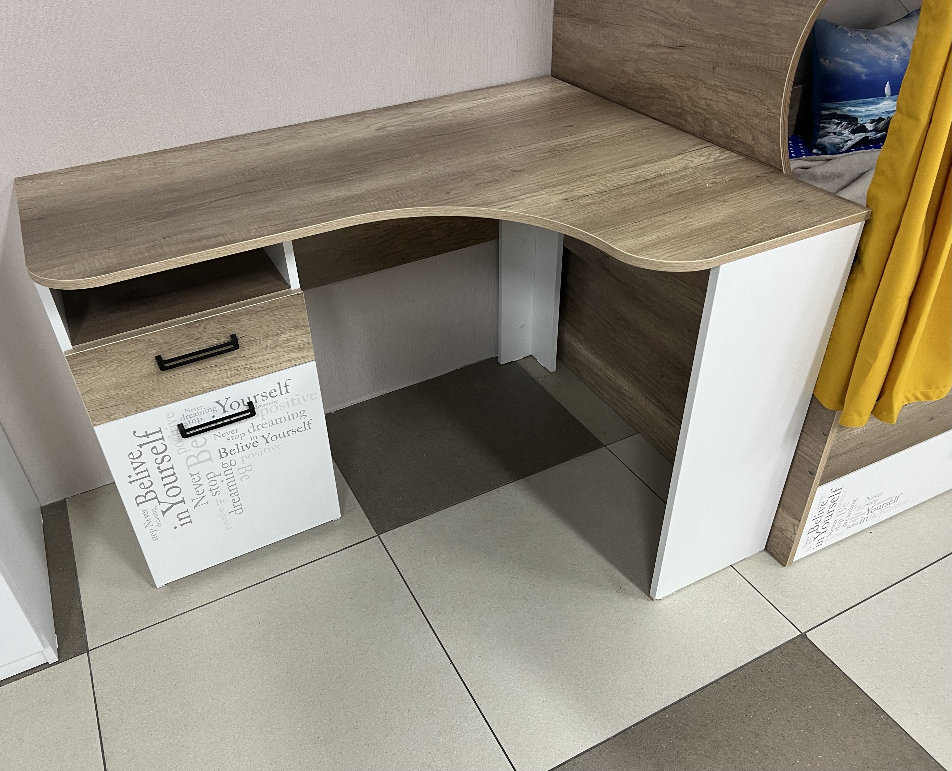 Мебель выполнена из сертифицированного, качественного, экологически чистого ЛДСП класса Е0,5 в сочетании цветов "дуб каньон + белый" и оформлена дизайнерским принтом.