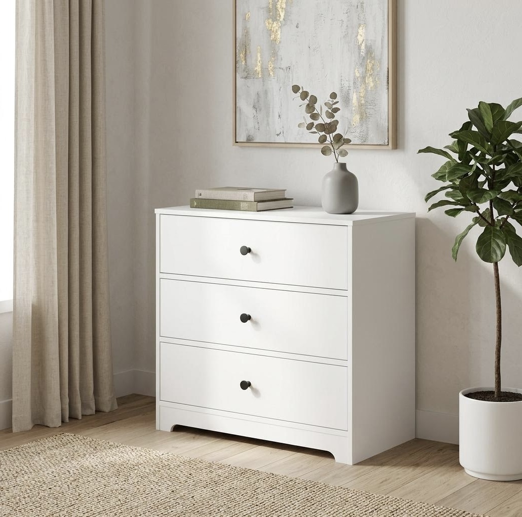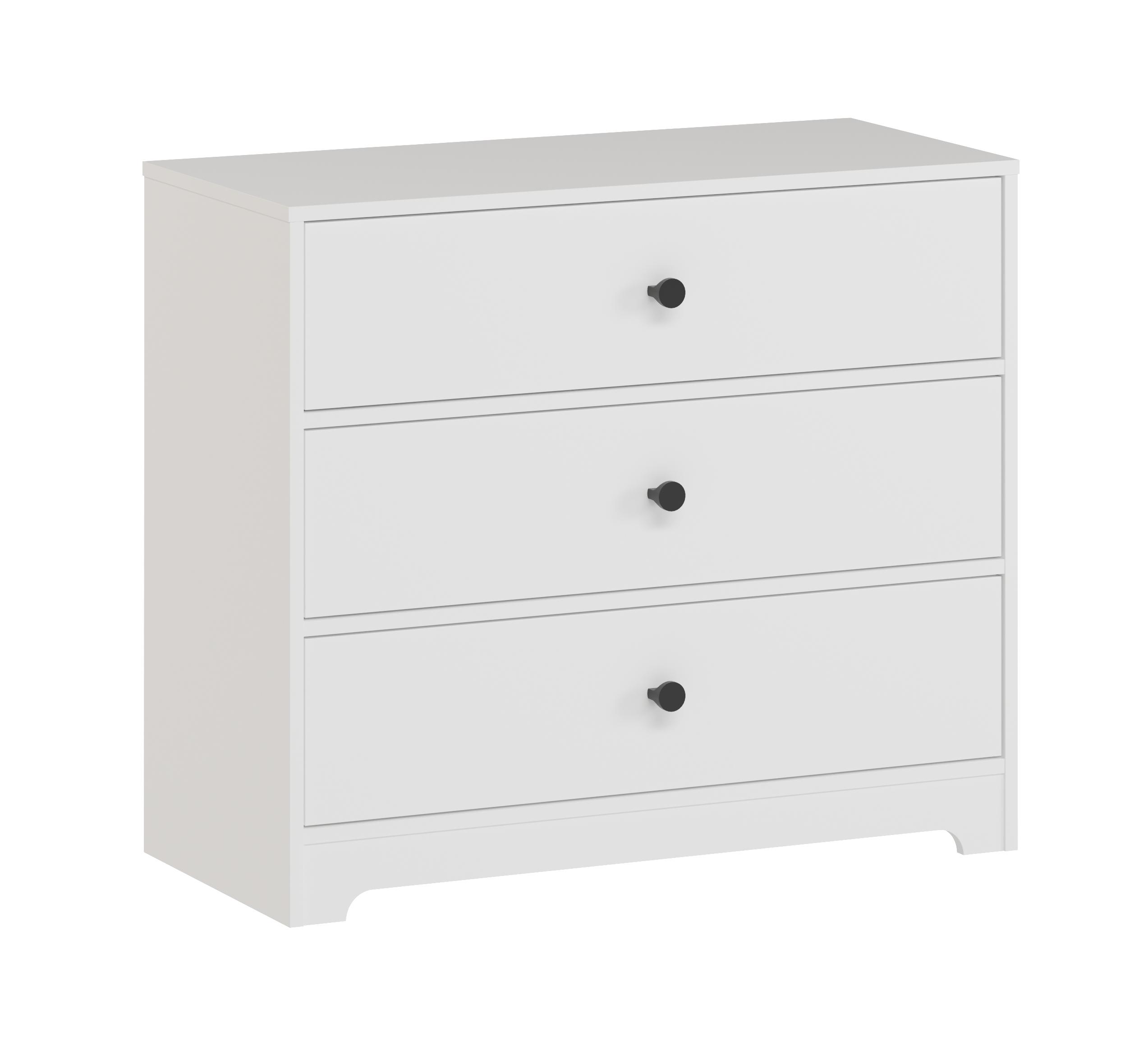 В комод встроены три выдвижных ящика на направляющих скрытого монтажа с ДОВОДЧИКАМИ.