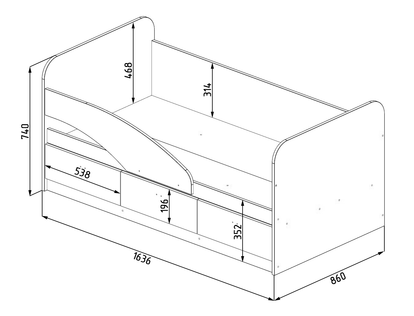 В кровать встроены три выдвижных ящика для белья и игрушек.