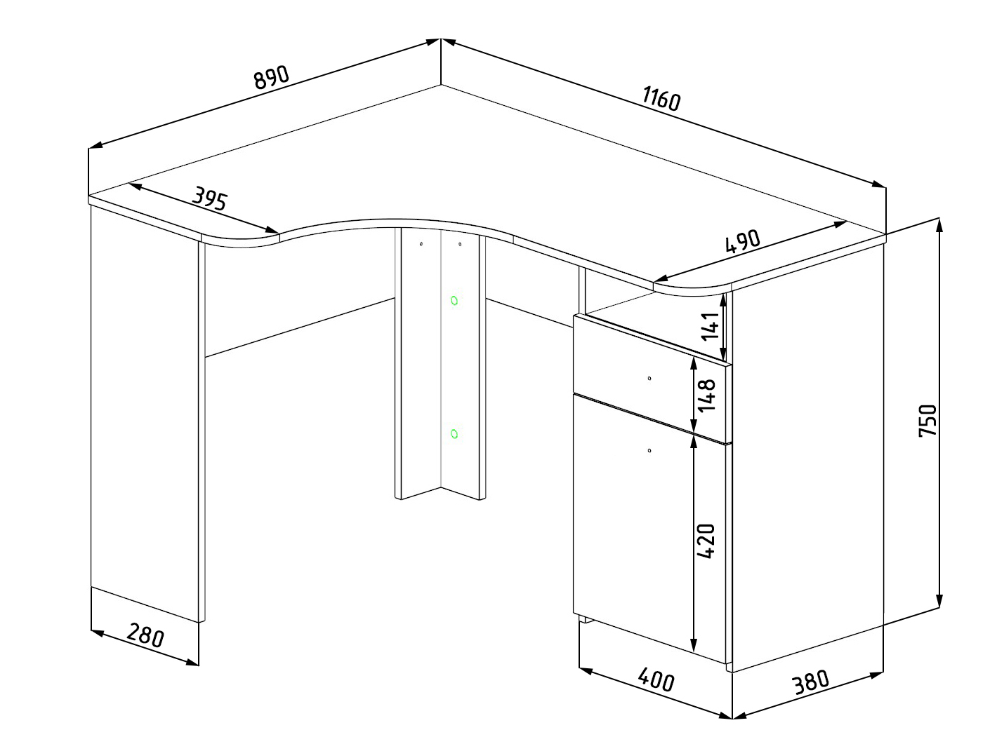 Габариты стола: ширина 1160 х высота 750 х глубина 890 мм