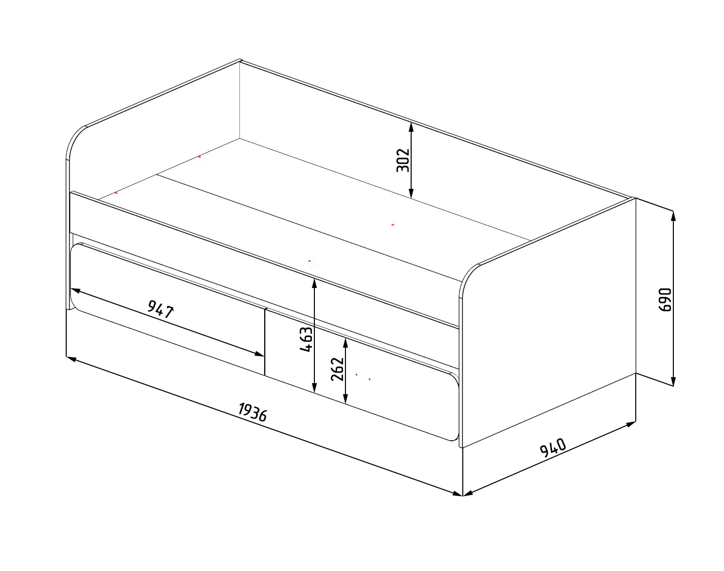 Габариты кровати: ширина 1936, глубина 940, высота 690 мм