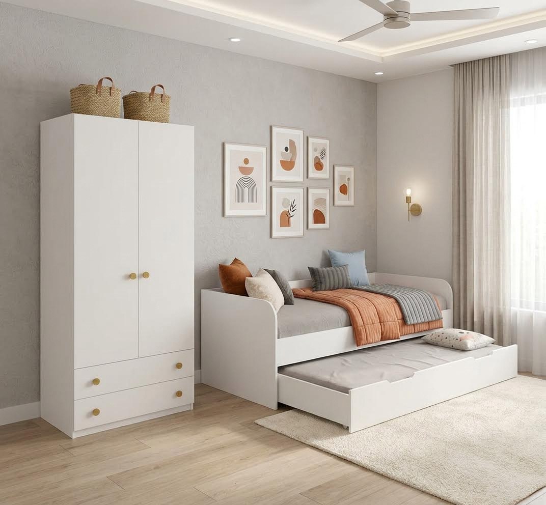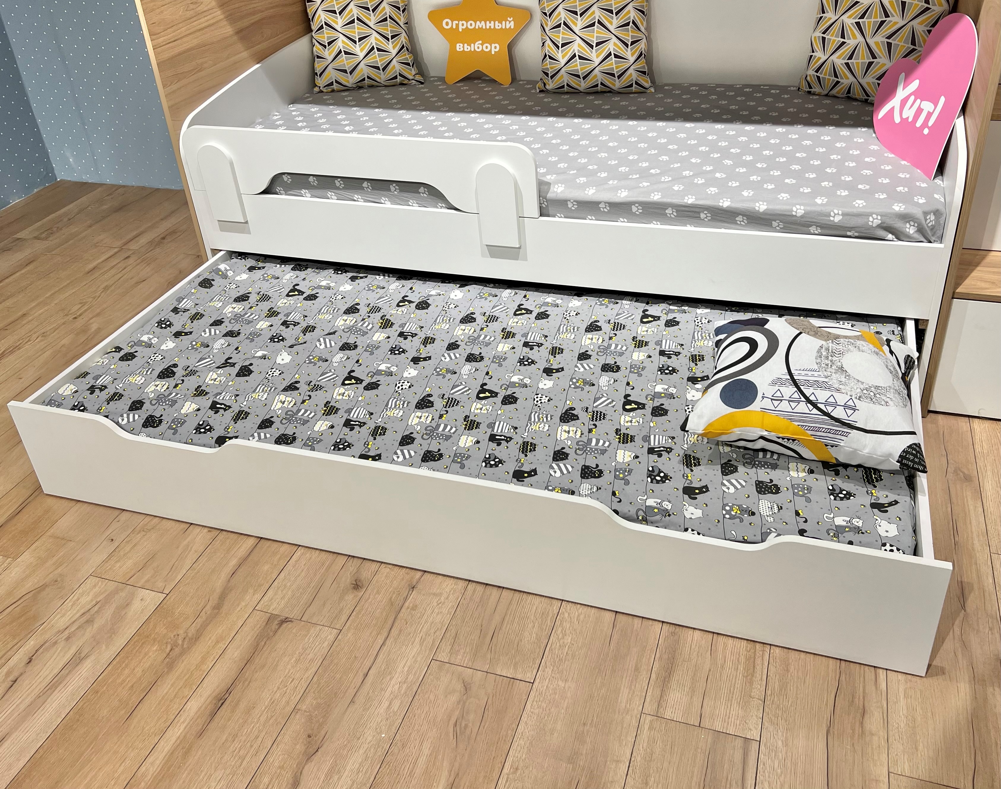 Экономия пространства: выдвижное спальное место легко убирается под основную кровать, освобождая место для игр и активного отдыха.